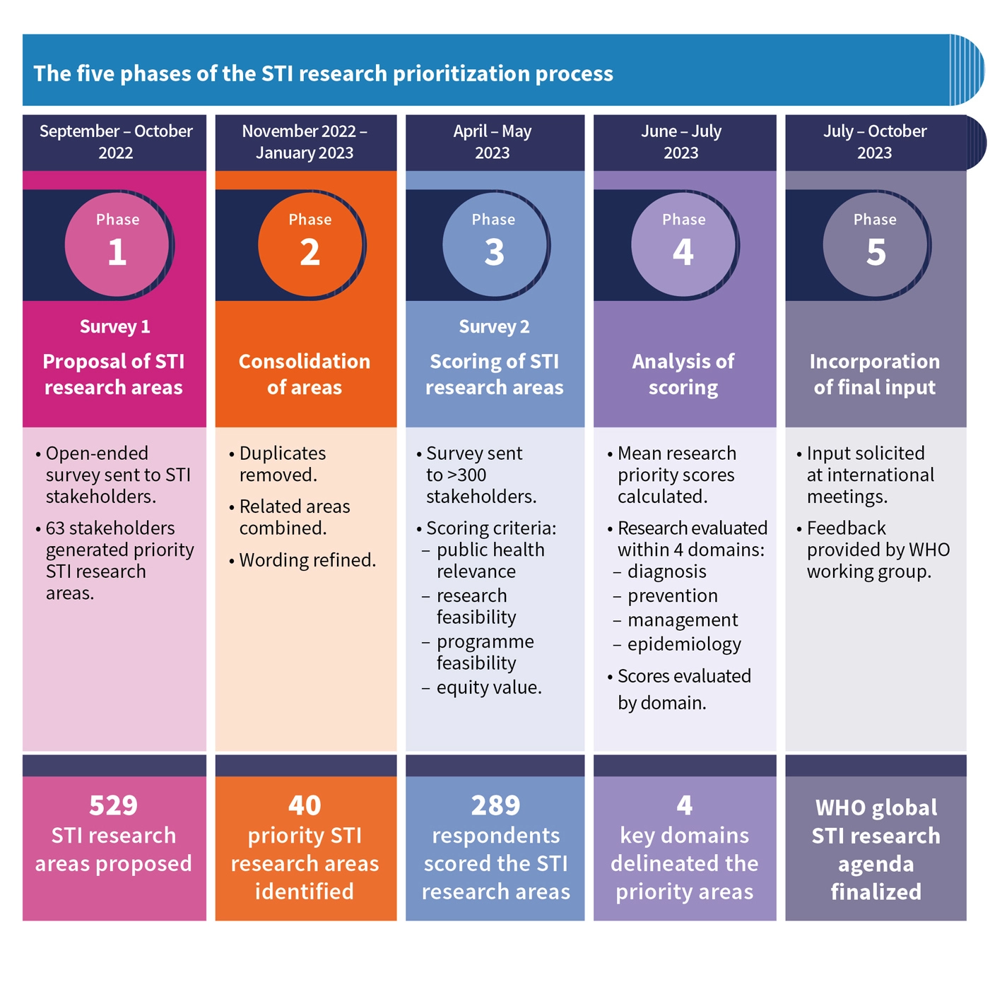 Sexually transmitted infections (STIs) have a profound impact worldwide. As part of the response to this global health challenge, WHO initiated an STI research priority-setting exercise. The resultant WHO global research agenda for STIs has prioritised 40 research areas to inform STI policies and programmes by 2030, across four key domains: diagnosis, prevention, management and epidemiology.
